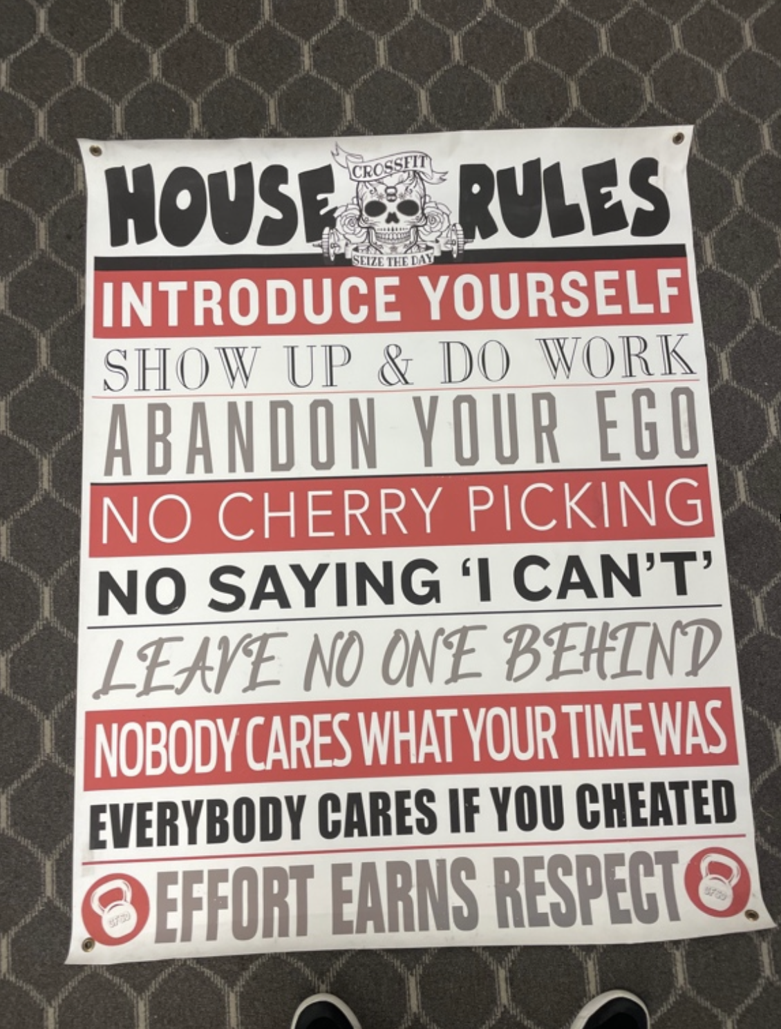 Do Your Best. We promise you the workouts will challenge you and push you to your perceived limits. We only ask that you prioritize using proper form and always try hard. Effort always earns respect. Nobody cares about your time on the board or how much weight you move, they only care that you tried and gave it your best.